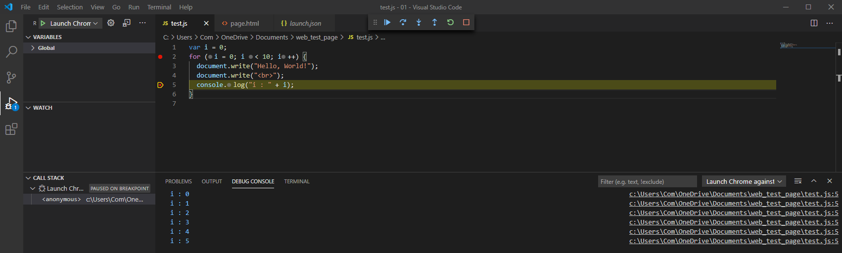 아까 test.js에 찍어둔 브레이크 포인트에서 멈추는 것을 확인할 수 있습니다. 다시 한번 F5를 눌러 계속 진행하면