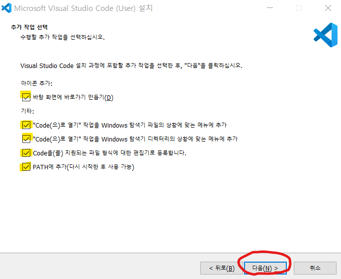 다음 버튼 누르고 최종 확인 버튼 누르고, 마지막으로 완료 버튼까지 클릭하면 vscode가 똭! 하고 나옵니다.