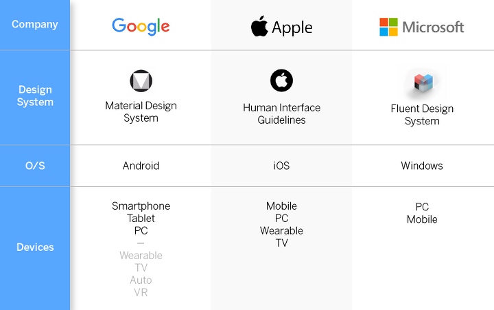 글로벌 IT 삼대장의 디자인 시스템 관련 비교표입니다. 한번 검색해서 훑어보시면 엄청난 분량의 가이드 정보와 역시 대인배답게 무료 리소스(아이콘)등이 넘쳐납니다. 하지만 이건 본인들의 O/S나 디바이스가 있는 경우고 일반적으로는 자사 웹 앱 서비스가 대부분일 겁니다. 그럼 일반적인 IT 서비스 기업을 기준으로 하나하나 설명해 보겠습니다.