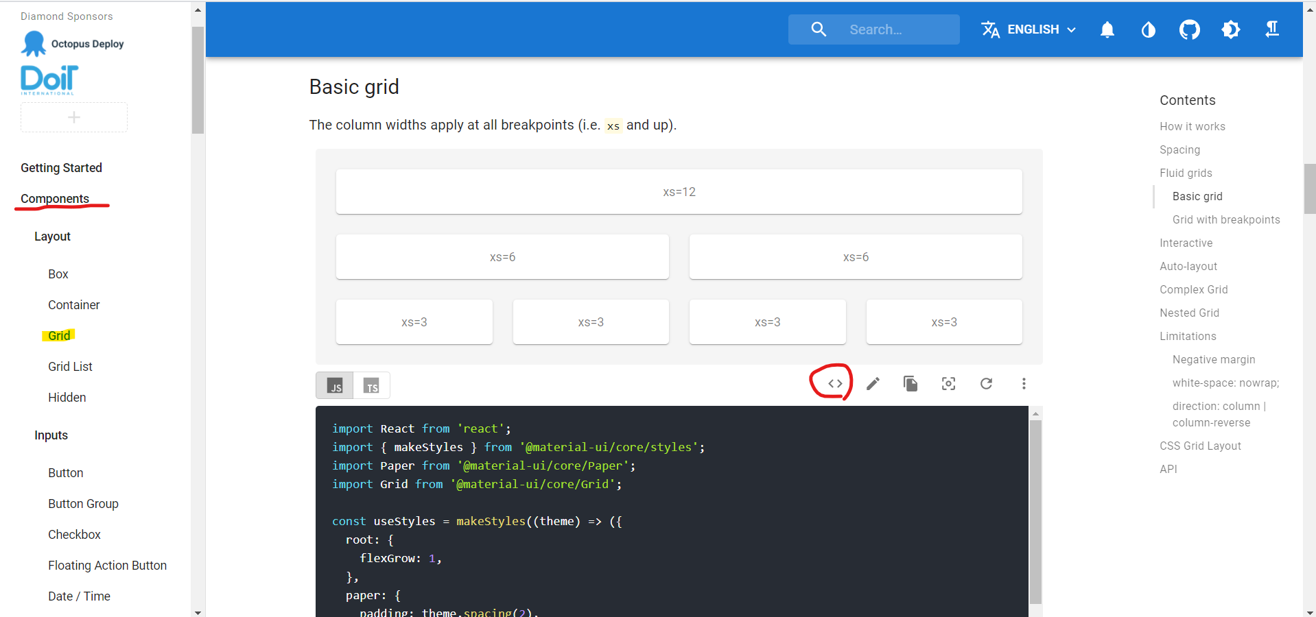 드디어 컴포넌트 종합 선물 세트 등장입니다! 中분류에서 小분류로 나눠지는데 나름 중요한 순서대로 올려놓은 것 같습니다. 먼저 中분류를 보면 Layout, Inputs, Navigation, Surfaces, Feedback, Data Display, Utils, Lab 있습니다. 이번에는 레이아웃의 그리드 눌러보시면 그리드 관련 시스템 설명과 데모 및 샘플 코드가 제공됩니다. 복붙 대환영!